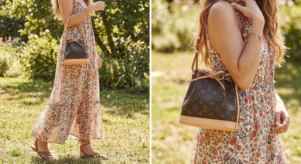 Louis Vuitton Noé can set the tone for your overall wear: it is a casual Bohemian holiday style with floral dresses, and a retro rock style with leather jackets.